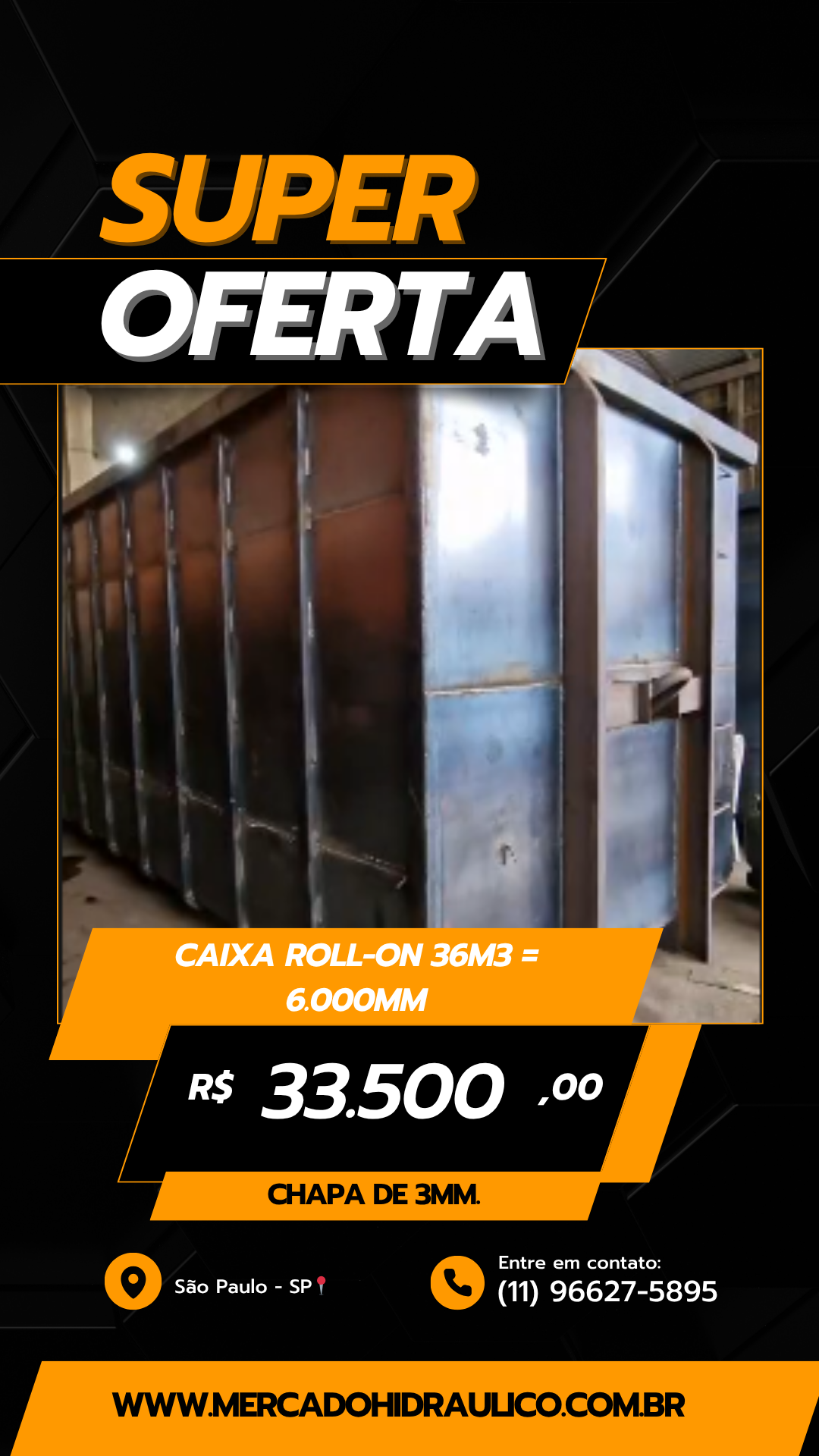 | Caixa Roll-on 36m3 = 6.000mm comprimento x 2.450mm largura interna x 2.500mm altura, toda construída em Chapa de 3mm. |