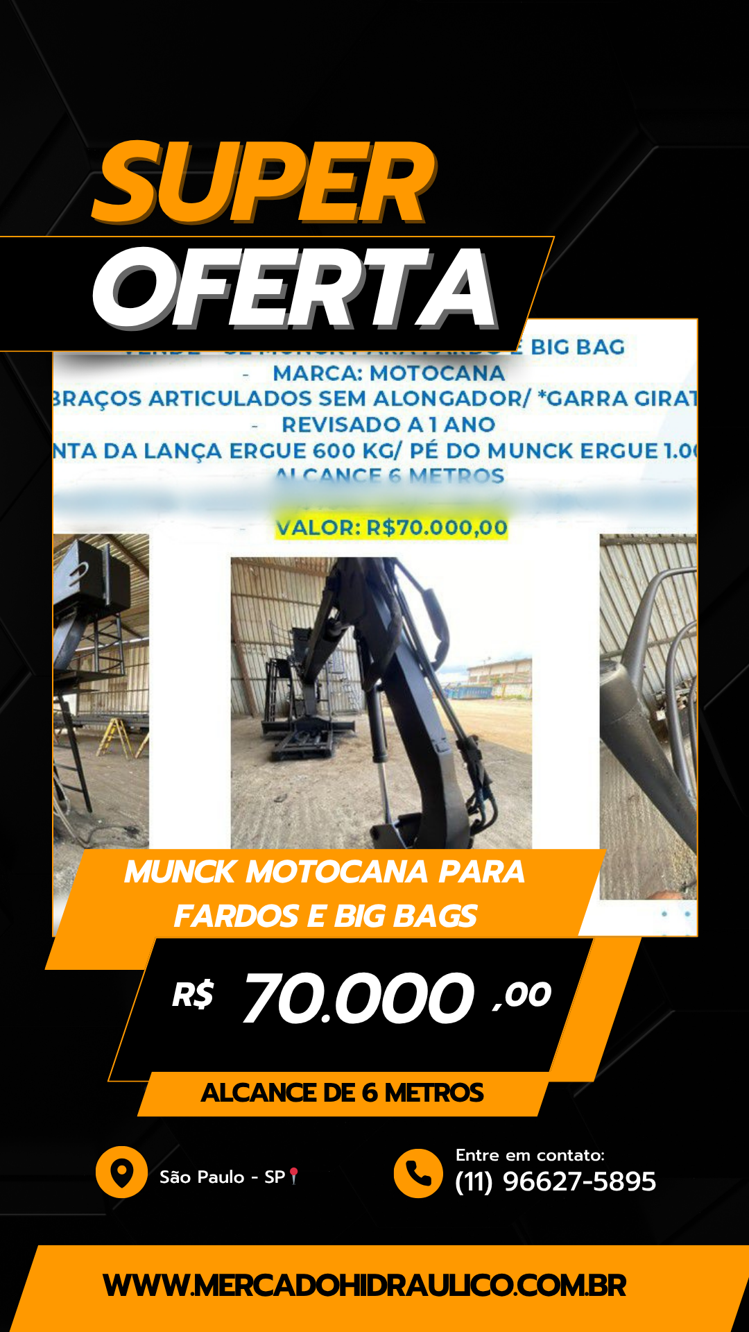 Capacidade de carga: Ergue 1.000 kg no pé do munck e 600 kg na ponta da lança.